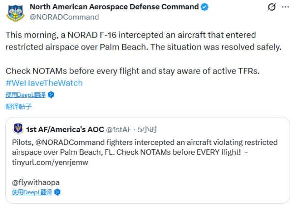 北美防空司令部在帖文中表示:"今天上午,一架北美防空司令部的F-16战斗机在棕榈滩上空拦截了一架闯入限制空域的飞机。事件已安全解决。"北美防空司令部与美国空军相关账号没有透露有关该飞机的更多信息,但在贴文中提示飞行员们查阅航行通告并确认飞行限制区信息。