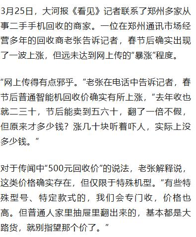 3月25日,大河报《看见》记者从郑州二手手机回收市场了解到,回收价格确有上涨,但远未达到"暴涨"程度,普通机型涨幅有限,数百元回收价仅限于特殊款式手机。而春节后经历一波上涨后,近期行情又出现回落。