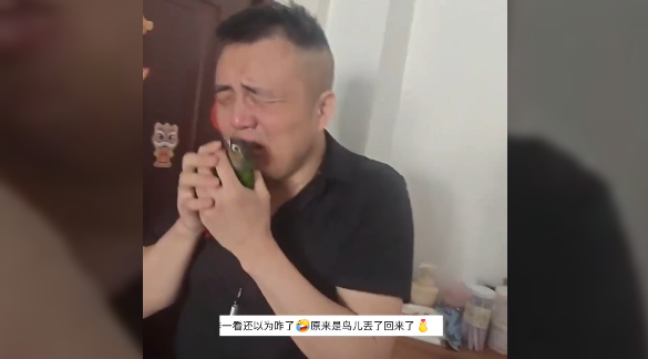 没想到在走失第三天的傍晚,鹦鹉竟自己飞回了家。男子开门看到爱鸟的瞬间,所有压抑的焦虑与思念彻底爆发。他小心翼翼地将鹦鹉紧紧握在手中,脸贴在毛茸茸的鸟身上,一边落泪一边不停亲吻,嘴里反复念叨着 "可算回来了,吓死我了",画面满是失而复得的狂喜与珍视。