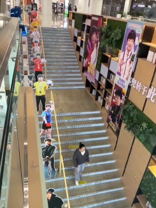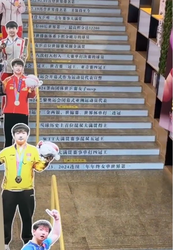 这个楼梯每一步台阶都写满了孙颖莎的成绩,还有所有关于她励志的话语句子,一阶一阶的在变更好更强,球迷们真的很爱莎莎,太感动了