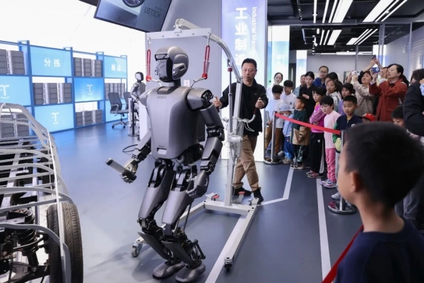 在北京机器人产业园(亦庄)的北京"机器人大世界",参观者在观看工业机器人检测无人驾驶汽车轮胎的场景演示。陈晓根摄(影像中国)