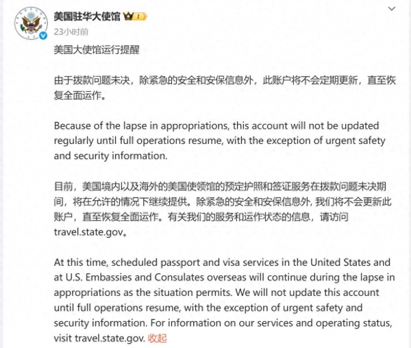 10月7日,美国驻华大使馆的官方微信公众号及微博账号公告称,由于拨款问题未决,美国驻华大使馆相关账号将暂停更新。相关公告称,目前,美国境内以及海外的美国使领馆的预定护照和签证服务在拨款问题未决期间,将在允许的情况下继续提供。除紧急的安全和安保信息外,美国驻华使领馆账号将不会更新,直至恢复全面运作。