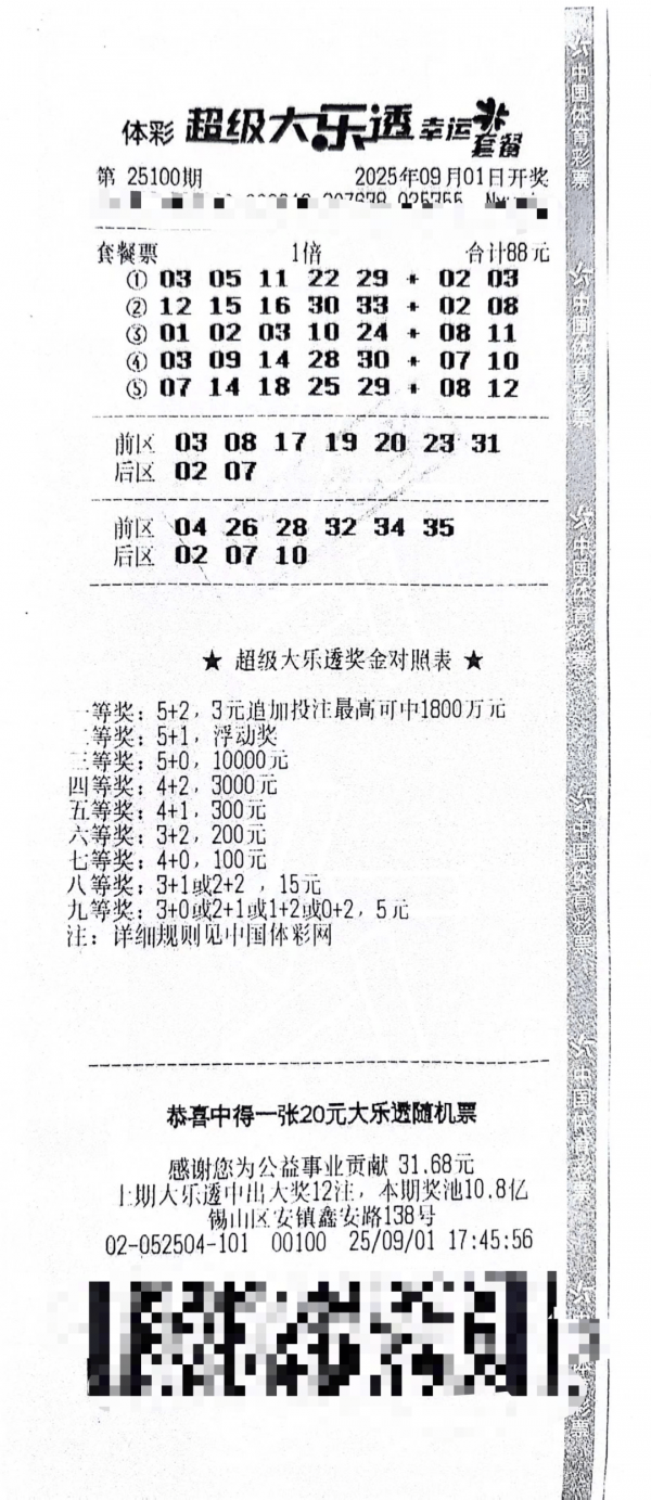 开奖当日,他在体彩销售网点随手选购了一张88元的大乐透"幸运套餐"票。