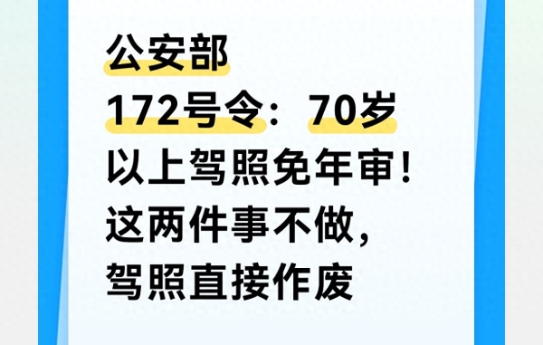 家里有70岁以上长辈还在开车的,这条2026年全面落地的公安部172号令一定要吃透。新规最大利好:70岁以上驾照取消年度审验,不用再跑车管所排队、不用参加安全学习、不用签注盖章,彻底省去繁琐流程。但很多人只听一半,误以为从此啥都不用管,结果漏掉两项法定要求,导致驾照被注销、上路按无证驾驶处理,保险不赔、罚款扣车,后悔都来不及。
