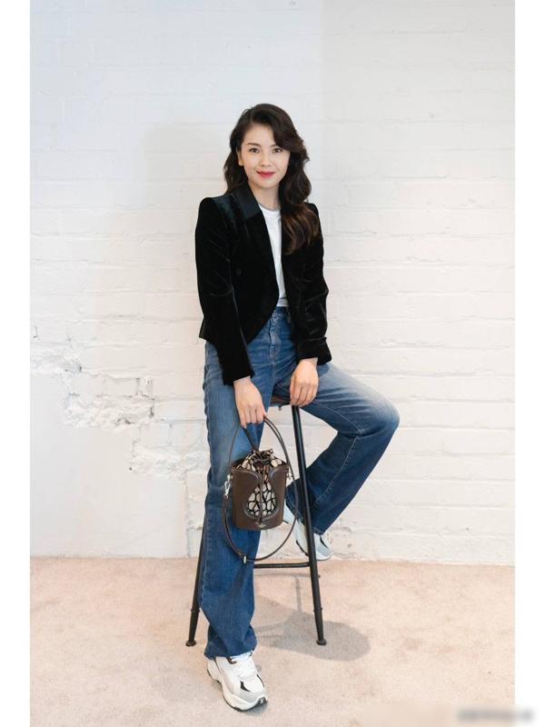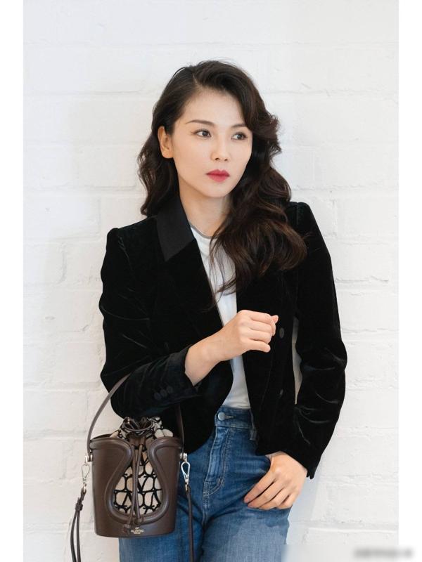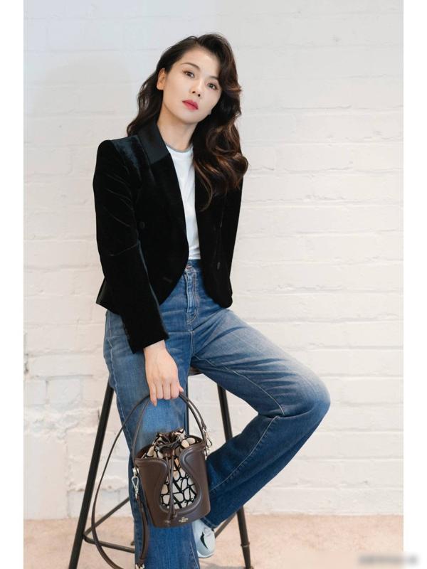西装与牛仔裤的搭配打造出了一种独特的气质,不仅展现了女性的身材优势,也展现了她们独特的品味和风格。黑色丝绒西装的优雅与修身牛仔裤的个性完美结合,创造出了一种时尚又不失优雅的风格。
