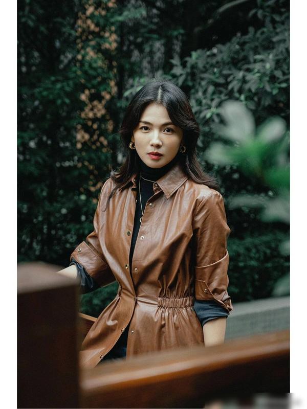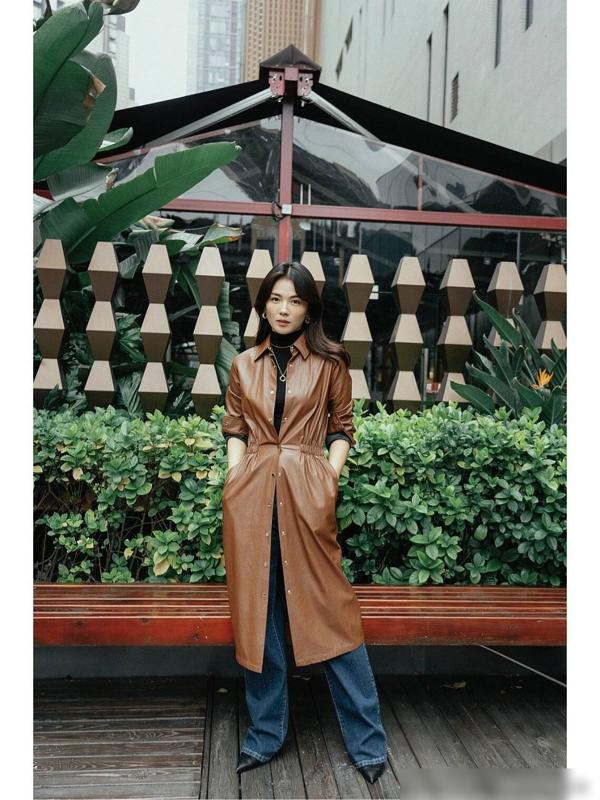 这件黑色的长款皮衣,展现出了一种无畏和坚毅的气质,厚实的皮革材质,彰显出一种强势和自信的风范 。而宽松的阔腿裤则与之形成了鲜明的对比,展现出了一种慵懒和随性的气质,裤脚的开叉设计,更是增添了一份时尚感和灵动感,凸显出刘涛的独特个性。