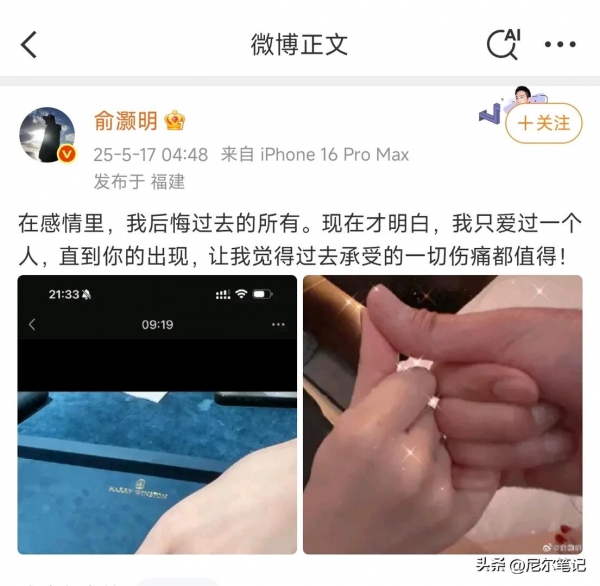 去年 5 月 17 日凌晨,他突然在社交平台晒出钻戒照和拉钩照,还配文:"直到你的出现,让我觉得过去承受的一切伤痛都值得!"