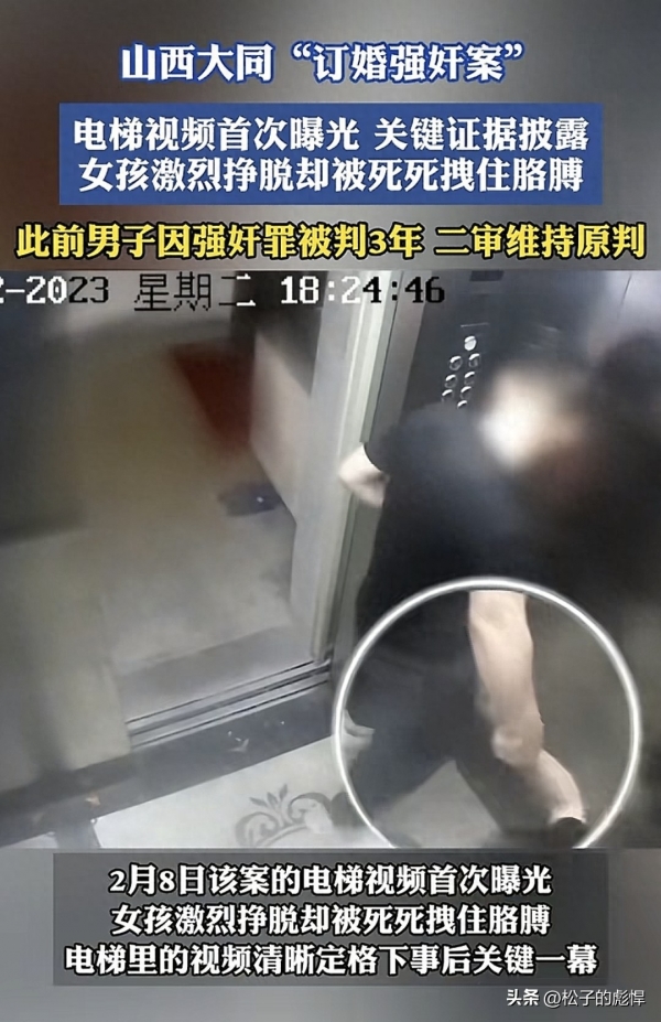 2.8日根据媒体报道,山西大同订婚强奸案二审依旧维持原判,事实清楚证据链足,男方3年有期徒刑。央视法治频道也公开了电梯监控的原视频,首次曝光。