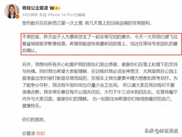 据谷爱凌透露,在经过几个月伤病恢复后,她首次开始在新西兰训练。然而,昨天一场人为事故导致意外受伤,已经做了医学影像检查,还在等待专家确认伤情。