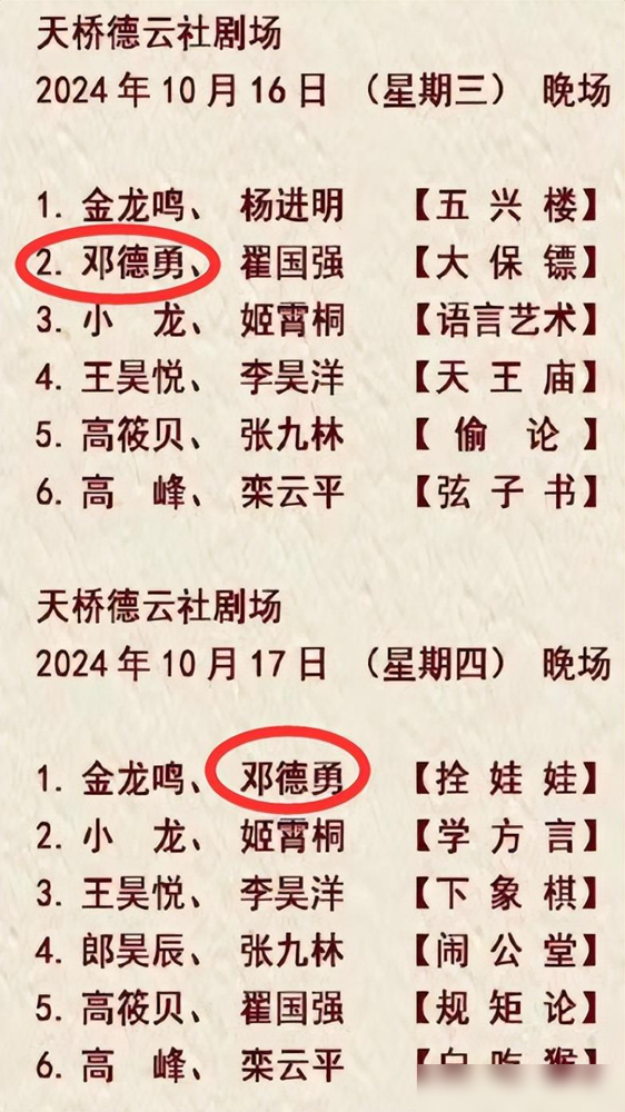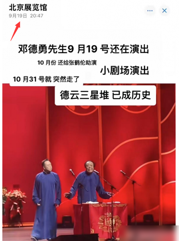 2023年10月31日,德云社69岁演员邓德勇在北京因突发疾病离世。