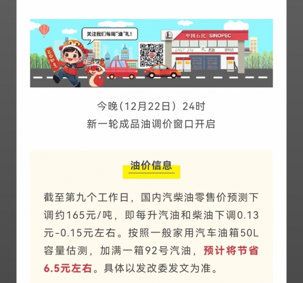 今晚24时后,国内油价将迎来年内最后一调,而且是连续第三次下调。算下来,加满一箱油省下的钱,尾气里竟弥漫着奶茶的香气。更有意思的是,今年大概率要成为近几年油价下跌幅度最明显的一年,这收官一"降"颇有意味。