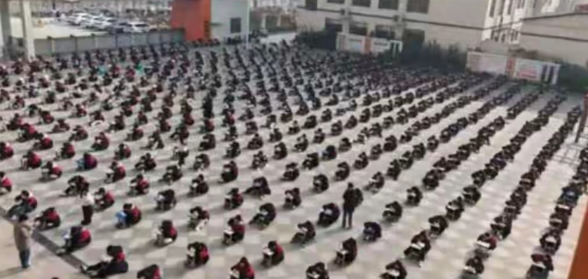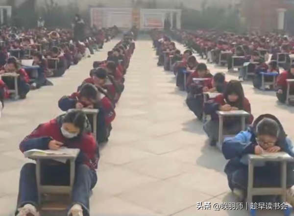 12月18日,河南周口市淮阳区翰林高级中学的操场变成了一个露天考场。数百名高二学生或坐或趴,在凳子上进行语文测试。这段视频迅速引发网络热议,画面中学生们低头俯身、双腿蜷缩的形象,被许多网友称为"寒风中苦读"。