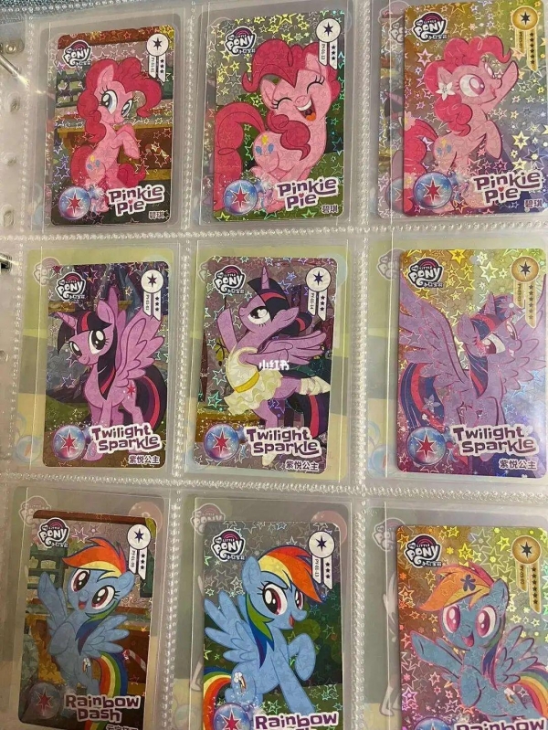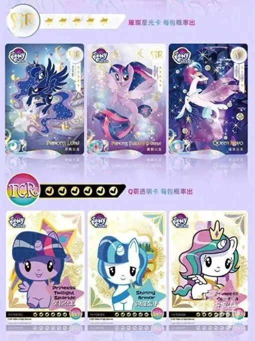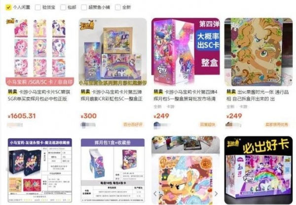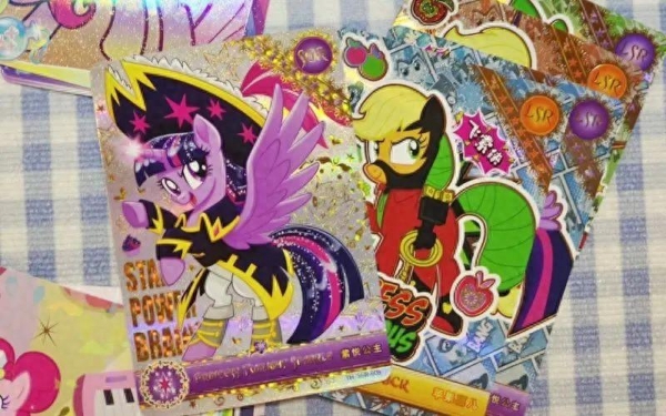 其中"小马宝莉"卡牌有趣影、辉月、彩虹等多种版本,彩虹5元/包,趣影2元/包,辉月10元/包,每包里面有5-6张卡。其他IP的卡牌也一样有各种包装,对应有不同的价格。