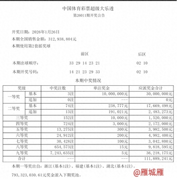 本期一等奖分落:浙江(基本1注 追),福建(基本1注),湖北(基本1注),一共3注。