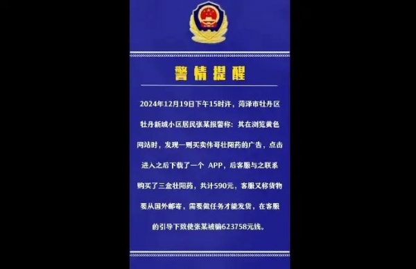 在当今这个看似便捷的网络时代,隐藏着诸多不为人知的黑暗角落。2024 年 12 月 19 日,山东菏泽牡丹新城小区的张某,未曾料到一次不经意的举动,会将自己拖入万劫不复的深渊。张某在那个午后,鬼使神差地浏览涉黄网站,一条售卖伟哥壮阳药的广告映入眼帘。那充满诱惑的文字与图片,瞬间勾住了他的心。他毫不犹豫地点击链接,下载 APP 并下单购买三盒壮阳药,花费 590 元。本以为能悄悄解决自己的"小问题",却不知一场巨大的风暴即将来临。