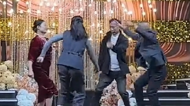 很快,四位长辈彻底放开,从简单的肢体摆动升级为"沉浸式蹦迪",时而并肩跳着整齐的踏步舞,时而互相调侃式地"斗舞",台下宾客见状纷纷举起手机拍摄,掌声与欢呼声此起彼伏,连新人都笑着站在一旁当起了"观众",婚礼氛围直接推向高潮。