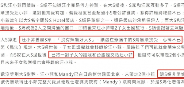并且据台媒报道,之所以S妈不想将抚养权给汪小菲是因为大S生前最在意的就是两个孩子,而汪小菲很有可能给了两个孩子完整的父爱,而汪小菲作为孩子的父亲,怎么会给不了孩子完整的父爱,难道是害怕马筱梅和汪小菲生的孩子分走汪小菲的父爱么?