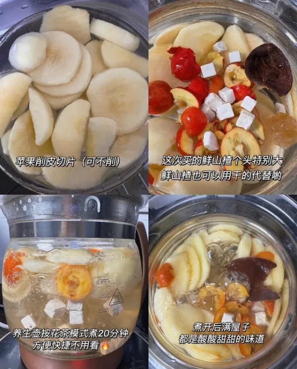 配料就是苹果、鲜山楂或者干山楂,加点陈皮和茯苓,甜甜酸酸的味道特别提神。
