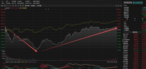 一方面,主板权重股与创业板呈现出明显的"跷跷板"效应:上证指数全天稳健上涨,而创业板指经历2%的深度调整后才勉强翻红,反映出资金从高估值成长股向低估值权重股的迁移趋势;