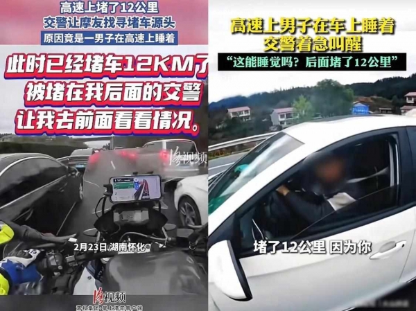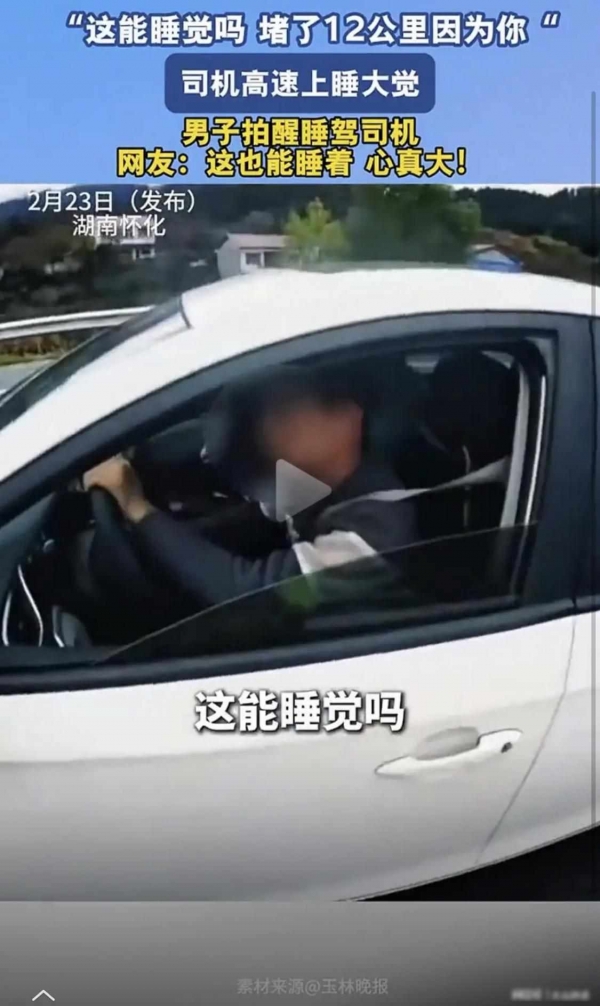 2月23号,湖南怀化一段高速主路上,一辆白色轿车没开双闪灯,也没摆三角警示牌,直接停在行车道上,司机在车里睡着了,后面的车堵了12公里,差不多40分钟才缓过来,高速上车速很快,突然停着个静止车辆,就像路上多了个水泥墩子一样危险。