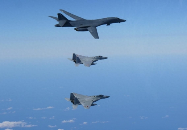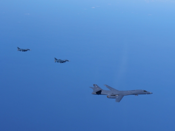 美军B-1B与航空自卫队F-2战斗机编队飞行