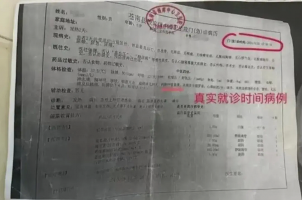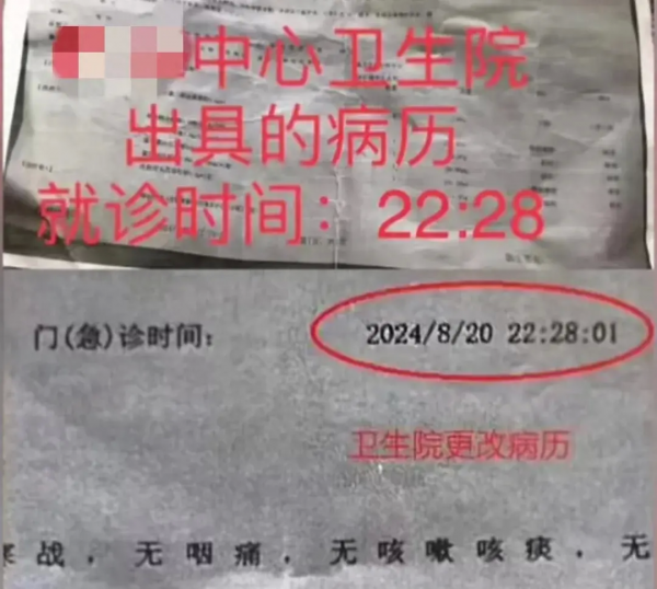 最后就是最重要的一个点,是否存在"病历造假"的嫌疑,男孩出事后,其父亲第一时间就去了卫生院,想要了解情况,却发现卫生院提供的两份病历有些很明显的篡改行为,且病历上就诊时间也对不上,第一次提供的病历上显示就诊时间是8月20日15点30分,检查结果是"两肺呼吸音清",可是第二次卫生院提供的病例单上,就诊时间直接显示到了晚上的22点28分,且检查结果也变成了"两肺呼吸音粗"。
