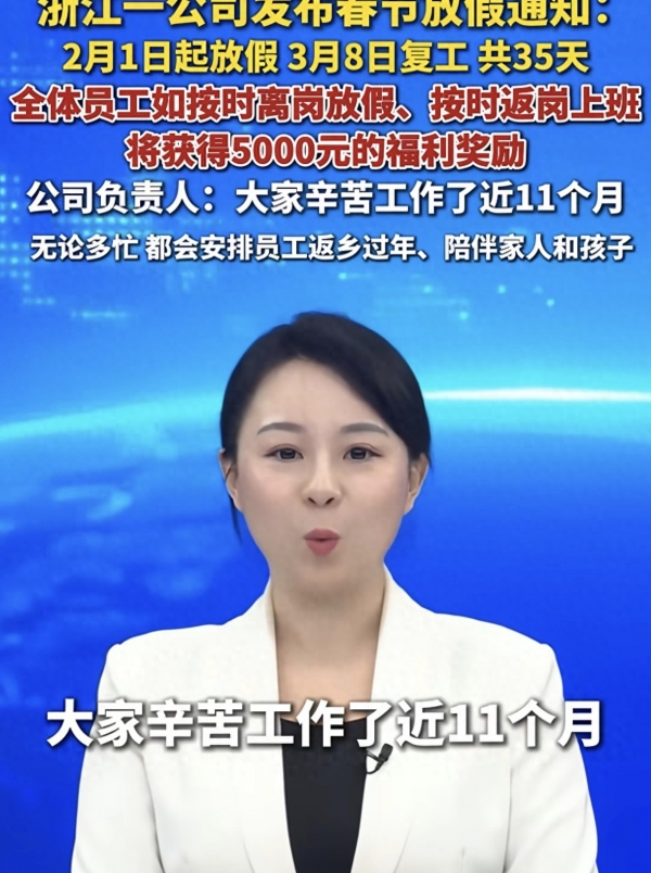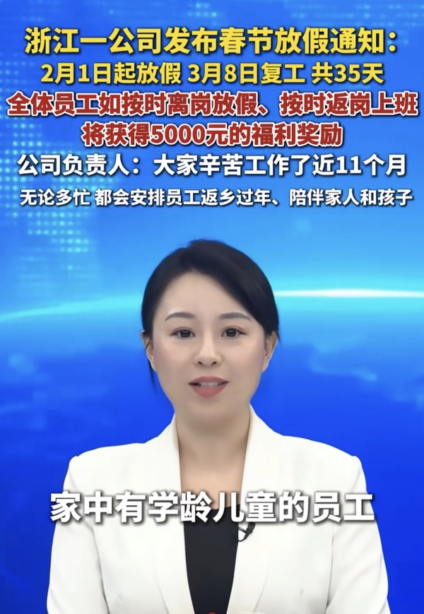 浙江温州有家公司,春节放假直接放35天!从2月1日开始歇,一直到3月8日才复工。更让人羡慕的是,只要员工按时离岗放假、按时返岗上班,就能拿到5000元的福利奖励,这奖励还是3月底发放呢。
