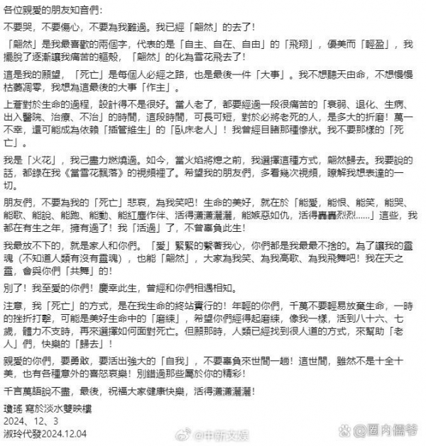 琼瑶说:"没有灵魂的肉体就不值得活下去,不如去安乐死"。虽然我国法律对"安乐死"还没有合法化,但不得不说,与其痛苦地苟延残喘,还不如选择体面地死去,大家认为呢?