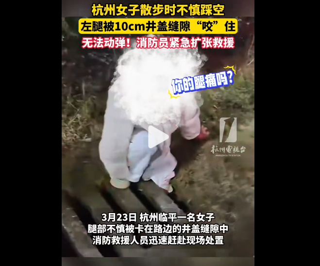 3月23日,杭州临平一名女子腿部不慎被卡在路边的井盖缝隙中,消防救援人员迅速赶赴现场处置,两个井盖的间隙仅10厘米左右,女子左腿膝盖处被卡在中间,左腿已有轻微擦伤。