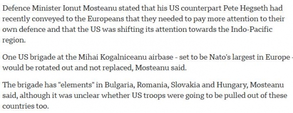 北约方面和美国都在对美军的此次"调整"进行淡化处理,但罗马尼亚方面的一些分析人士和媒体称,欧洲国家发出"团结信号"并考虑加强其"军事存在"以进行补偿非常重要。