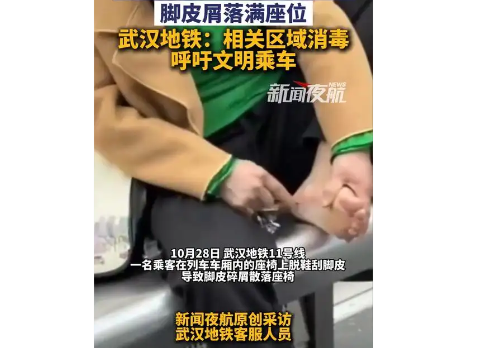 这起事件发生在2025年10月28日中午的武汉地铁11号线上。一名女子在车厢座位上使用类似指甲刀的工具专注地刮脚皮,产生的碎屑散落在座位和车厢地面,引发广泛关注。