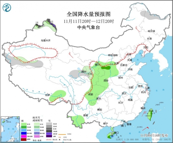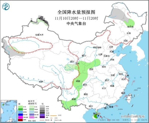 11月9日20时至10日20时,新疆塔城和阿勒泰地区、内蒙古东北部、黑龙江西北部等地部分地区有小到中雪或雨夹雪,其中,新疆阿勒泰高海拔地区等地局地有大到暴雪(10~18毫米)。山西北部、河北北部、北京、山东南部、江苏西部、安徽、江西中南部、浙江中北部、广东北部和南部、四川盆地、云南南部、海南岛等地的部分地区有小到中雨。内蒙古中东部、黑龙江北部、辽宁南部等地部分地区有4~6级风。南海大部海域、台湾海峡将有6~7级、阵风8~9级的大风(见图3)。