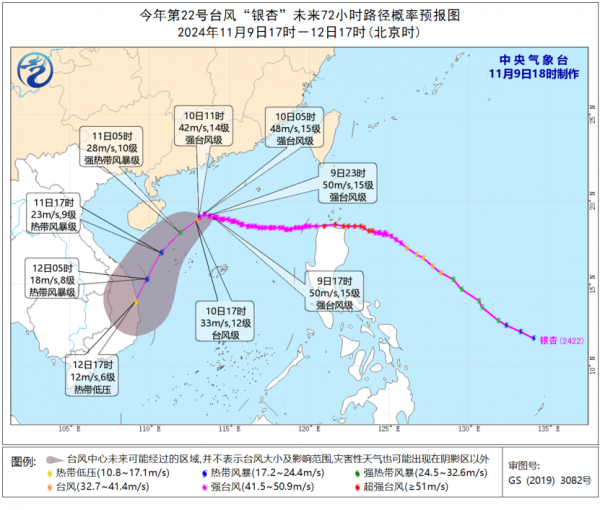 今年第22号台风"银杏"未来72小时路径概率预报图(9日17时-12日17时)