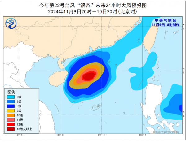 预计,9日20时至10日20时,受冷空气和台风"银杏"的共同影响,台湾海峡、南海北部和中部、西沙群岛、海南岛东部沿海、福建沿海、广东沿海将有6-8级、阵风9-10级的大风,其中南海西北部和中西部的部分海域风力可达9-11级、阵风12-13级,"银杏"中心经过的附近海域风力可达12-15级,阵风16-17级(见图2)。