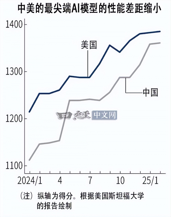 该研究机构对美国和中国的顶级AI模型的性能进行测试的结果显示,2024年1月两者的分数差距达到9.26%,而到2025年2月这一差距缩小到了1.7%。