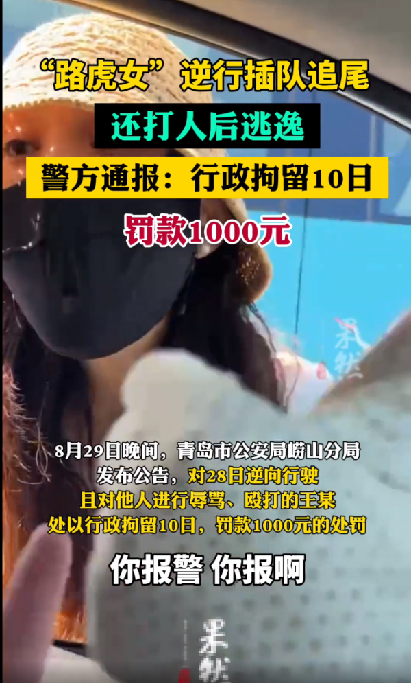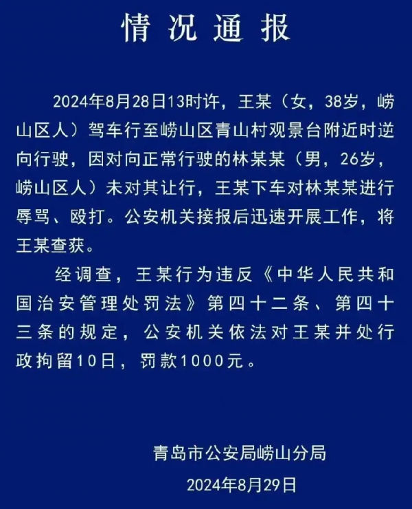 8月28日,38岁的女司机王某在崂山区青山村观景台附近逆向行驶,因对向的26岁男司机林某某未让行,王某下车对其进行了辱骂和殴打,并在男子报警后驾车肇事逃逸。