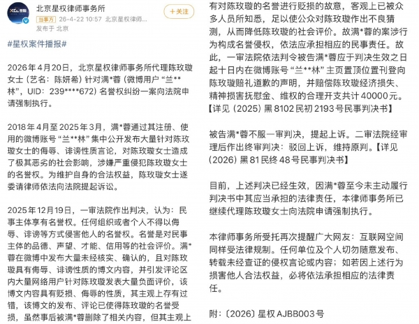 2026年4月20日,陈妍希工作室向法院提交的一份强制执行申请,让这场持续了整整七年的网络侵权纠纷,再次成为全网关注的焦点。此前她起诉微博用户满某长期发布侮辱诽谤言论,一审二审都赢了官司,可对方直到现在都没履行置顶道歉和支付4万元赔偿的义务,陈妍希方同时明确表示,所有获赔款项将全额捐赠给公益机构。