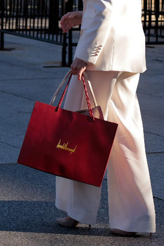 她离开白宫时,手里还提了个印有特朗普金色签名的红色礼品袋。尚不清楚袋子里装着什么。