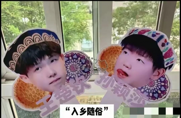 有人设计了莎莎和王楚钦的"民族风"周边:扇子上印着两人穿维吾尔族服饰的照片,莎莎戴了顶小巧的小花帽,王楚钦穿了件带花纹的上衣;