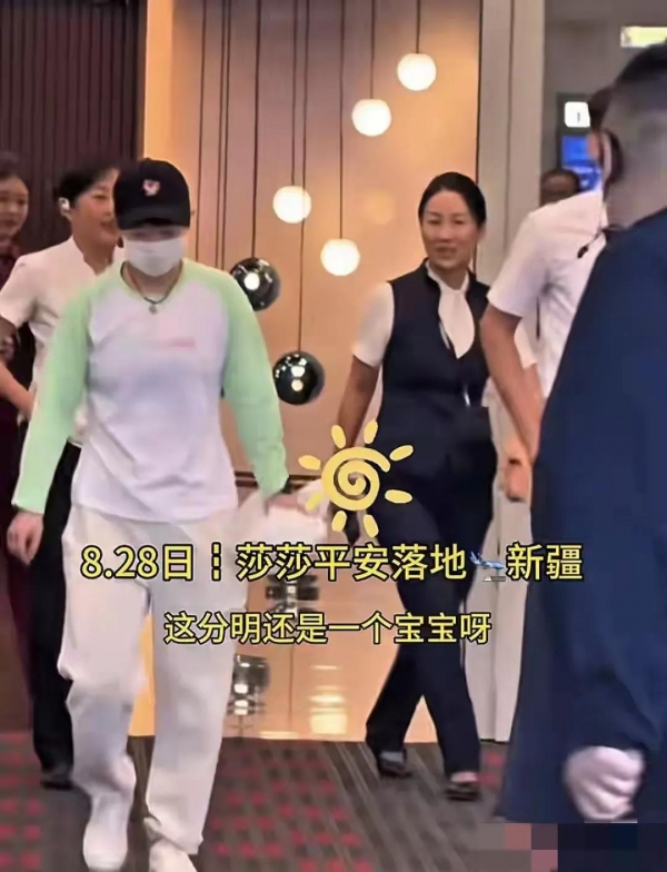 之前莎莎的机场照,大多都是运动装配着鸭舌帽,挺常见的,可这次她换了身"新鲜货":浅绿的短上衣搭着浅灰运动裤;