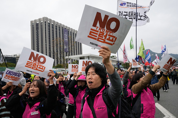 10月18日,韩国首尔,抗议者游行反对美国总统特朗普对韩国的关税政策。 视觉中国