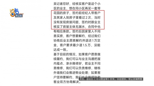 后来链家方面发来文字回复,签约前经纪人带客户以及家人到房子看过两次,没有发现房屋问题,签约时和业主核实了,房屋主体无漏水。