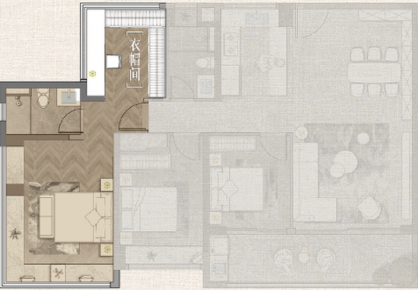 方案二是"套房主卧IMAX进阶化",也就是集起居、衣帽间、兴趣、主卫四大功能于一体,打造成酒店式行政套房,让主卧成为真正意义上的主人私属领地。L型环幕飘窗不仅能够实现270°观景视野,增加采光通风,还能够提高空间利用率,打造成读书角、收纳台等。