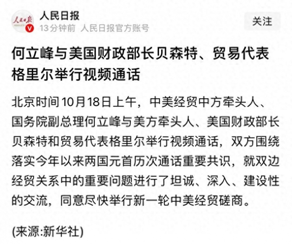 10月17日,美国财长贝森特与我们进行了视频通话,中方认为双方交流坦诚、深入、有建设性。这意味着双方都愿意共同推动中美关系健康发展。