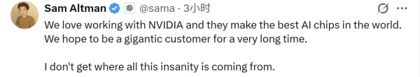 OpenA的CEO奥尔特曼当天也在社交媒体X上发文澄清,"我们喜欢与英伟达合作,他们生产世界上最好的人工智能芯片。我们希望长期成为他们的大客户。我实在搞不懂这些毫无根据的疯狂传言是从哪里来的。"