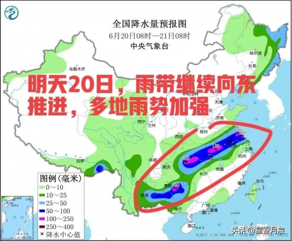 明天20日,雨带继续向东推进,多地雨势加强