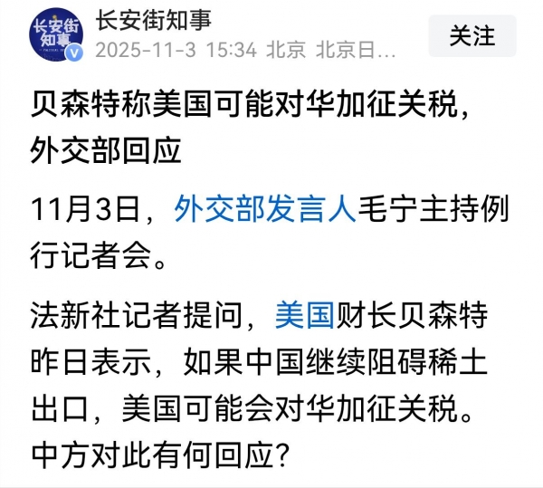 对此,外交部发言人毛宁3日指出,"关于中国的稀土出口管制政策,中方主管部门已经多次阐明了立场。中美经贸团队吉隆坡磋商的成果充分说明,对话和合作是解决问题的正确途径,威胁和施压无助于问题的解决。"