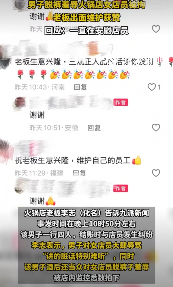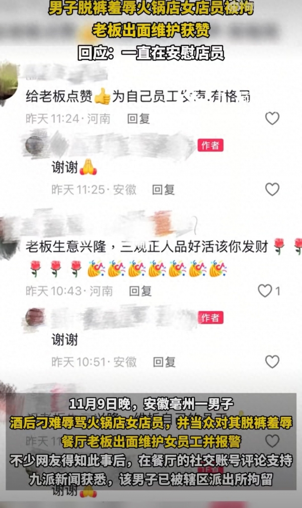 11月9日晚,安徽亳州一火锅店上演令人愤慨一幕:一名醉酒男子结账时不仅对女店员疯狂辱骂,竟还当众脱裤羞辱。关键时刻,老板挺身报警并坚决维护员工,事件曝光后引发网友集体声援。目前,涉事男子已被警方拘留,但这场关于尊严与职场保护的讨论仍在持续发酵。