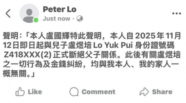 "本人卢国辉特此声明,本人自2025年11月12日即日起与儿子卢煜培卢煜培身份证号码Z418XXX(2)正式断绝父子关系。此后有关卢煜培之一切行为及金钱纠纷,均与我本人、我的家人一概无关。"