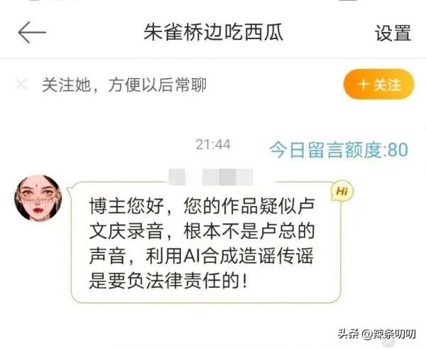 卓仕琳七老板应该和大杨嫂的关系比较好,她是三只羊方面唯一一个针对录音问题站出来表态的人。事发之后第一时间就找到了爆料博主,明确和对方说卢文庆的录音是假的,里边的声音根本不是他,是ai合成的。
